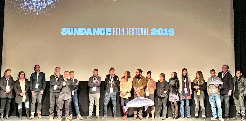 The Sea of Shadows crew on stage for our Sundance premiere. Matt is center right holding a the large vaquita cut-out.